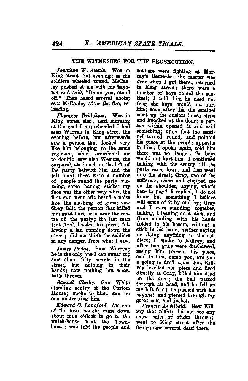 **Edward G. Langford** is one of the town watch. I came down about nine o'clock to go to the watch-house next to the Townhouse. I was told the people and soldiers were fighting at Murray’s Barracks; the matter was over when I got there. I returned to King Street; there were a number of boys around the sentinel. I told him he need not fear, the boys would not hurt him. Soon after this, the sentinel went up the Custom House steps and knocked at the door; a person within opened it and said something. Upon that, the sentinel turned around and pointed his piece at the people opposite to him. I spoke again, told him there was no danger, the boys would not hurt him. I continued talking with the sentry until the party came down, and then I went into the street. Gray, one of the sufferers, came and clapped me on the shoulder, saying, "What's here to pay?" I replied, "I do not know, but something I believe will come of it by and by." Gray and I were standing together, talking, I leaning on a stick, and Gray standing with his hands folded in his bosom, without a stick in his hand, neither saying nor doing anything to the soldiers. I spoke to Killroy, and after two guns were discharged, seeing him present his piece, I said to him, "Damn you, are you going to fire?" Upon this, Killroy leveled his piece and fired directly at Gray, killing him dead on the spot; the ball passed through his head, and he fell on my left foot. He pushed with his bayonet and pierced through my great coat and jacket.