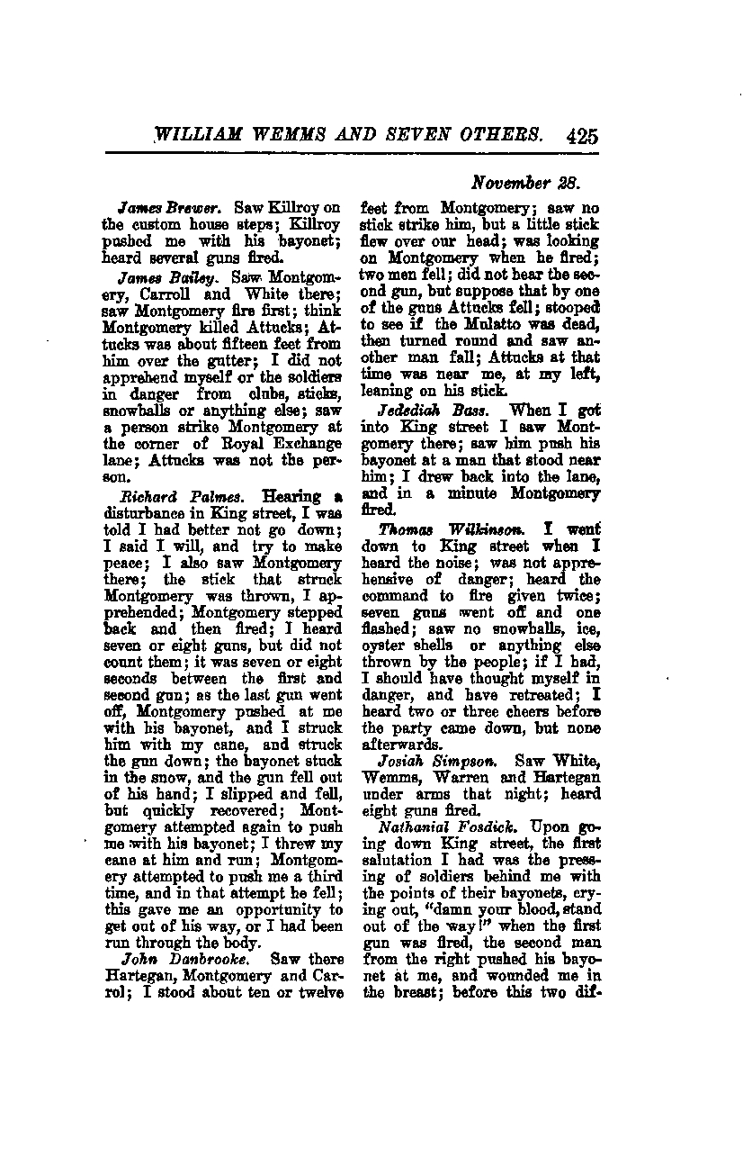 Upon going down King Street, the first salutation I had was the pressing of soldiers behind me with the points of their bayonets, crying out, "Damn your blood, stand out of the way!" When the first gun was fired, the second man from the right pushed his bayonet at me, and wounded me in the breast. Before this, two different...