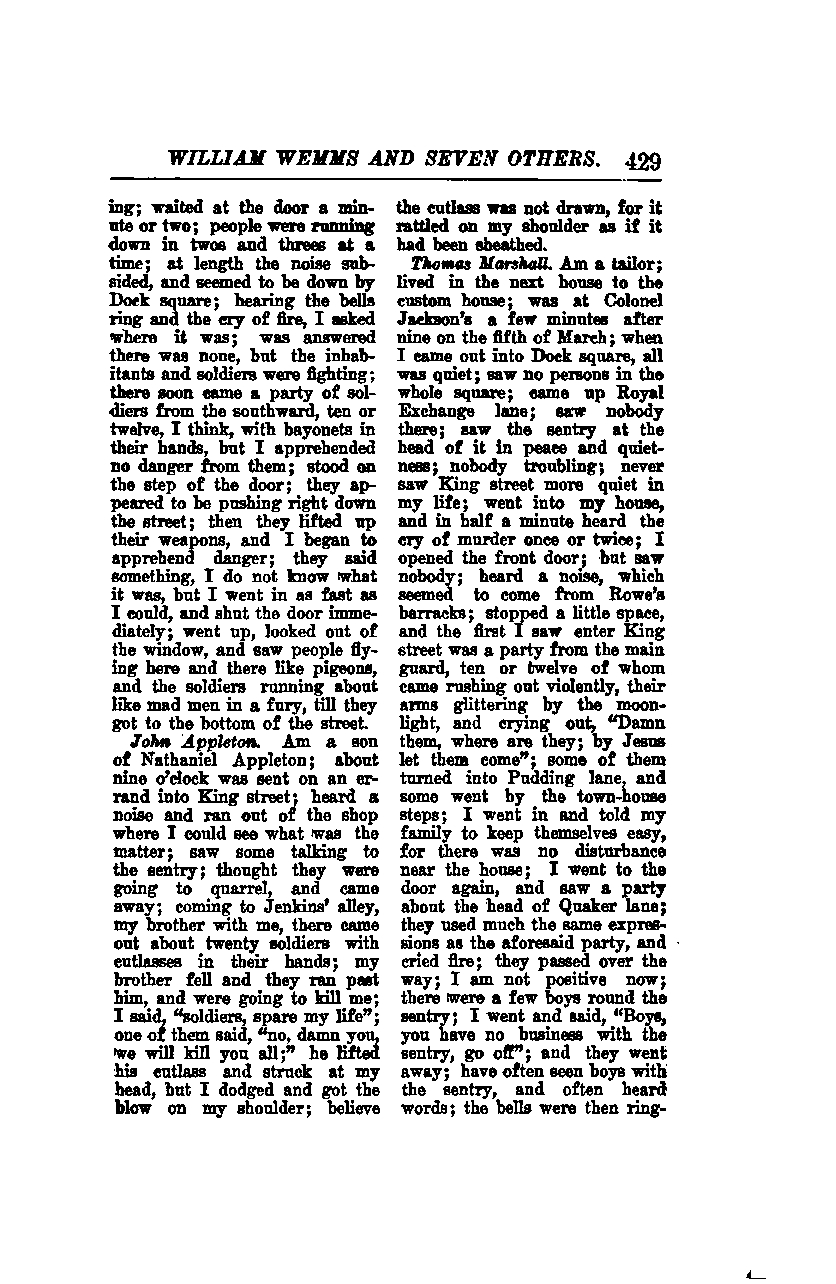 John Appleton, son of Nathaniel Appleton, stated: "About nine o'clock, I was sent on an errand into King Street. I heard a noise and ran out of the shop to see what was the matter. I saw some people talking to the sentry; I thought they were going to quarrel, so I came away. As I was coming to Jenkins' Alley, one of them said, 'No, damn it, we will kill you all.' He swung his cutlass and struck at my head, but I dodged and got the blow on my shoulder. I believe the cutlass was not drawn, for it rattled on my shoulder as if it had been sheathed."