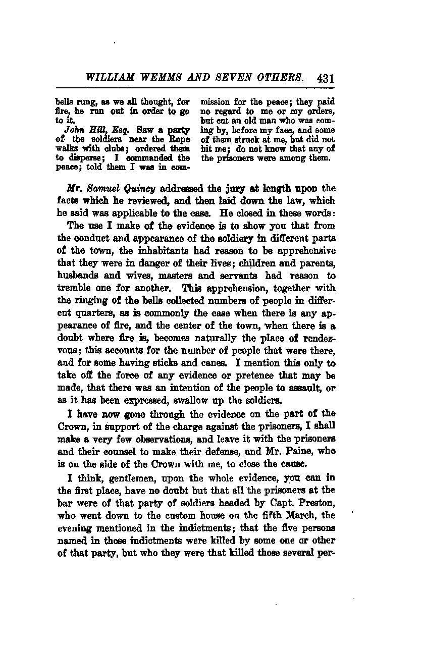 "I think, gentlemen, upon the whole evidence, you can, in the first place, have no doubt but that all the prisoners at the bar were of that party of soldiers headed by Capt. Preston, who went down to the custom house on the fifth of March, the evening mentioned in the indictments; that the five persons named in those indictments were killed by someone or other of that party, but who they were that killed those several persons..."