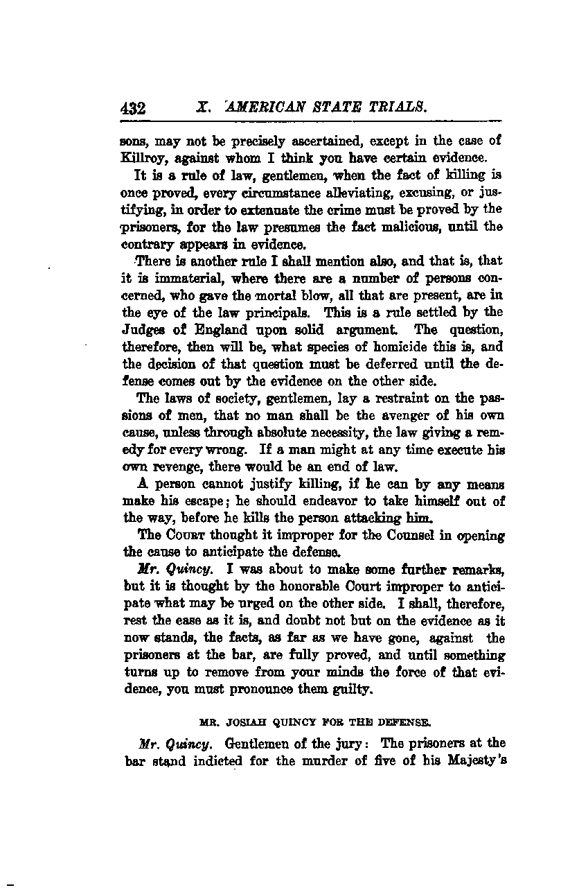 Mr. Quincy, Gentlemen of the jury: The prisoners at the bar stand indicted for the murder of five of his Majesty's subjects.