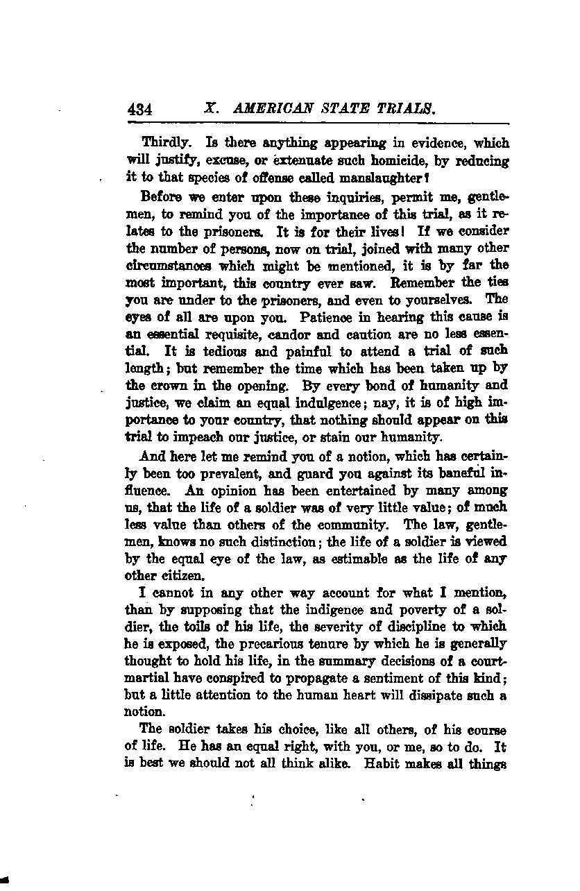 And here let me remind you of a notion which has certainly been too prevalent, and guard you against its baneful influence. An opinion has been entertained by many among us that the life of a soldier was of very little value, of much less value than others of the community. The law, gentlemen, knows no such distinction; the life of a soldier is viewed by the equal eye of the law as estimable as the life of any other citizen.