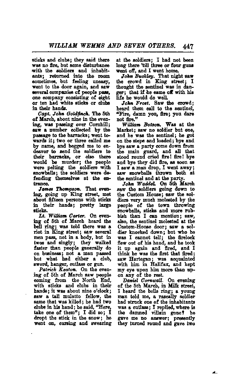 William Botson was at the market and saw no soldiers except for the sentinel, who climbed the steps and loaded his weapon. Soon after, a party came down from the main guard, and the surrounding crowd shouted, "Fire! Fire!" Eventually, they did fire, and as soon as Botson saw a man fall, he left the scene. He also witnessed snowballs being thrown at both the sentinel and the party.