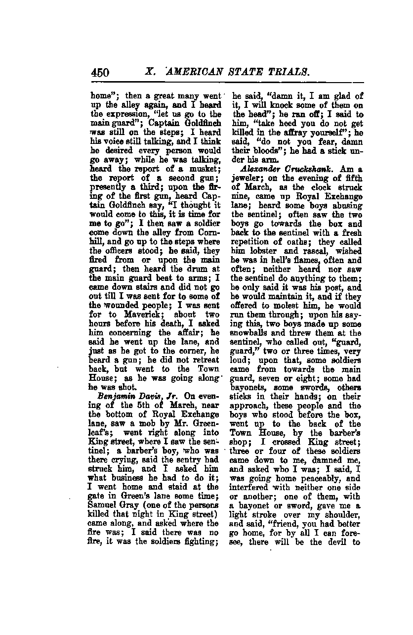 I am a jeweler. On the evening of the fifth of March, as the clock struck nine, I came up Royal Exchange Lane. I heard some boys abusing the sentinel. I often saw the two boys go towards the box and back to the sentinel with a fresh repetition of oaths; they called him lobster and rascal, wished he was in hell's flames, often and often. Neither heard nor saw the sentinel do anything to them; he only said it was his post, and he would maintain it, and if they offered to molest him, he would run them through. Upon his saying this, two boys made up some snowballs and threw them at the sentinel, who called out, "guard, guard," two or three times, very loud. Upon that, some soldiers came from towards the main guard, seven or eight; some had bayonets, some swords, others sticks in their hands. On their approach, these people and the boys who stood before the box went up to the back of the Town House, by the barber's shop. I crossed King Street; three or four of these soldiers came down to me, damned me, and asked who I was. I said I was going home peaceably and interfered with neither one side nor another. One of them, with a bayonet or sword, gave me a light stroke over my shoulder and said, "friend, you had better go home, for by all I can foresee, there will be the devil to pay."