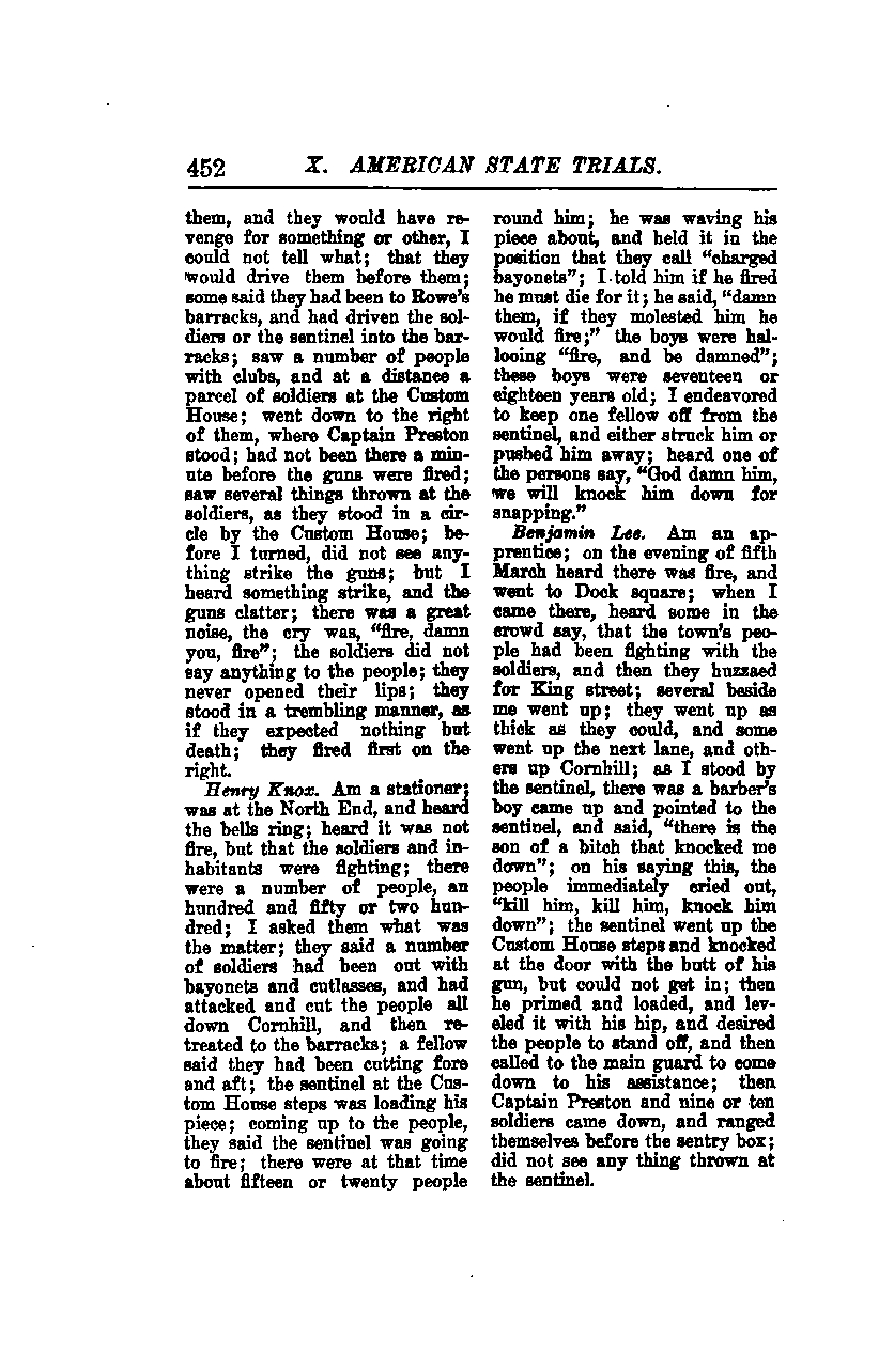 I saw them, and they would have revenge for something or other, I could not tell what; that they would drive them before them. Some said they had been to Rowe’s barracks and had driven the soldiers or the sentinel into the barracks. I saw a number of people with clubs, and at a distance, a group of soldiers at the Custom House. I went down to the right of them, where Captain Preston stood. I had not been there a minute before the guns were fired. I saw several things thrown at the soldiers as they stood in a circle by the Custom House. Before I turned, I did not see anything strike the guns, but I heard something strike, and the guns clatter. There was a great noise; the cry was, “Fire, damn you, fire.” The soldiers did not say anything to the people; they never opened their lips. They stood in a trembling manner, as if they expected nothing but death. They fired first on the...