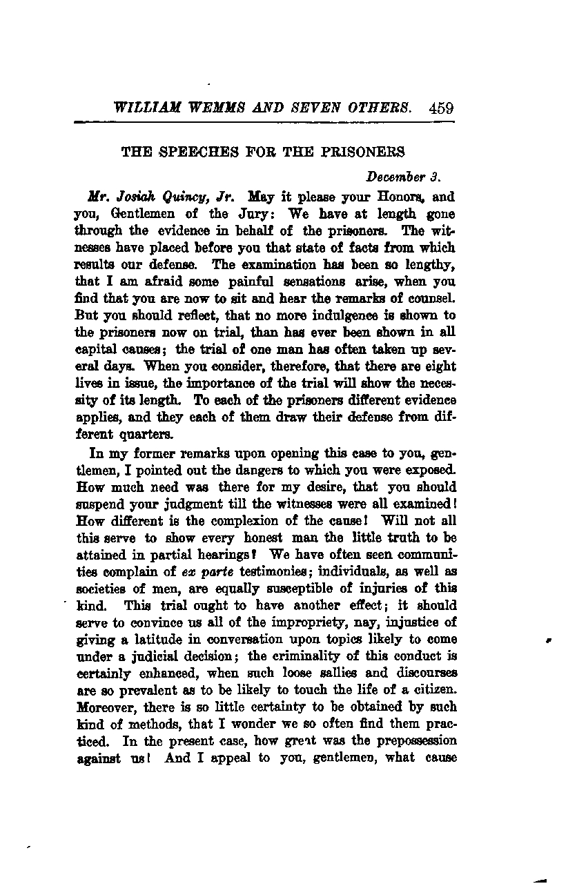 Mr. Josiah Quincy, Jr.: May it please your Honor, and you, Gentlemen of the Jury: We have at length gone through the evidence in behalf of the prisoners. The witnesses have placed before you that state of facts from which results our defense. The examination has been so lengthy that I am afraid some painful sensations arise when you find that you are now to sit and hear the remarks of counsel. But you should reflect that no more indulgence is shown to the prisoners now on trial than has ever been shown in all capital causes; the trial of one man has often taken up several days. When you consider, therefore, that there are eight lives in issue, the importance of the trial will show the necessity of its length. To each of the prisoners, different evidence applies, and they each of them draw their defense from different quarters.