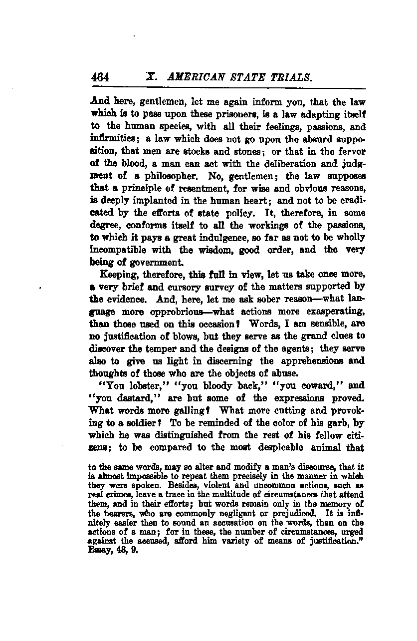 And here, gentlemen, let me again inform you that the law which is to pass upon these prisoners is a law adapting itself to the human species, with all their feelings, passions, and infirmities. It is a law which does not go upon the absurd supposition that men are stocks and stones, or that in the fervor of the blood, a man can act with the deliberation and judgment of a philosopher. No, gentlemen; the law supposes that a principle of resentment, for wise and obvious reasons, is deeply implanted in the human heart and not to be eradicated by the efforts of state policy. It, therefore, in some degree, conforms itself to all the workings of the passions, to which it pays a great indulgence, so far as not to be wholly incompatible with the wisdom, good order, and the very being of government.