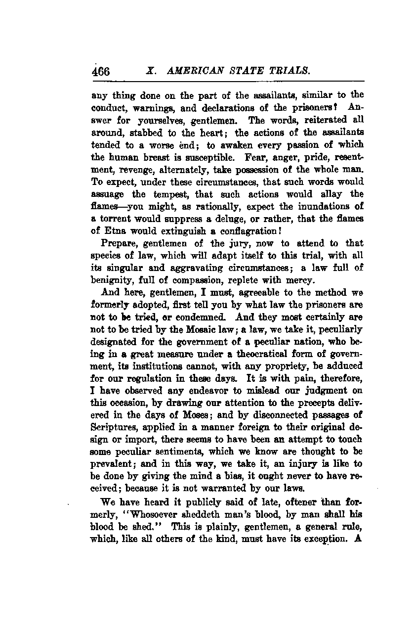 And here, gentlemen, I must, agreeable to the method we formerly adopted, first tell you by what law the prisoners are not to be tried or condemned. And they most certainly are not to be tried by the Mosaic law; a law, we take it, peculiarly designated for the government of a peculiar nation, who being in great measure under a theocratical form of government, its institutions cannot, with any propriety, be adduced for our regulation in these days. It is with pain, therefore, that I have observed any endeavor to mislead our judgment on this occasion by drawing our attention to the precepts delivered in the days of Moses; and by disconnected passages of Scriptures, applied in a manner foreign to their original design or import, there seems to have been an attempt to touch some peculiar sentiments, which we know are thought to be prevalent. And in this way, we take it, an injury is likely to be done by giving the mind a bias it ought never to have received, because it is not warranted by our laws.
