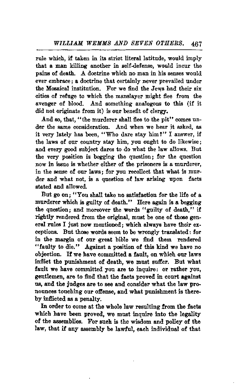 Consider the statement, "You shall take no satisfaction for the life of a murderer which is guilty of death." Here again is a begging of the question; and moreover, the words "guilty of death," if rightly rendered from the original, must be one of those general rules I just now mentioned, which always have their exceptions. But those words seem to be wrongly translated: for in the margin of our great Bible, we find them rendered "faulty to die." Against a position of this kind, we have no objection. If we have committed a fault, on which our laws inflict the punishment of death, we must suffer. But what fault we have committed, you are to inquire; or rather, you, gentlemen, are to find that the facts proved in court against us, and the judges are to see and consider what the law pronounces touching our offense, and what punishment is thereby inflicted as a penalty.
