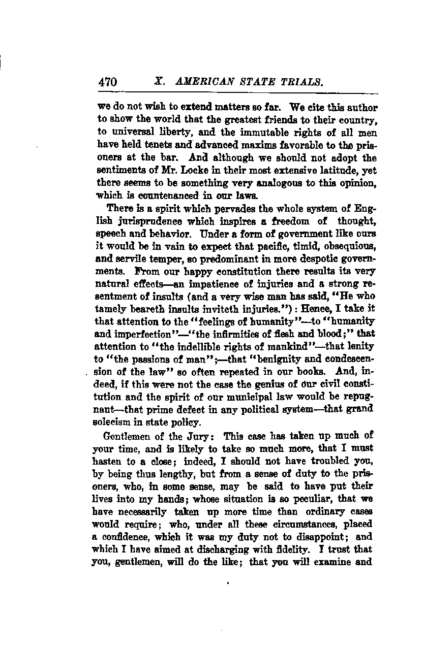 Gentlemen of the Jury: This case has taken up much of your time, and is likely to take so much more, that I must hasten to a close; indeed, I should not have troubled you by being thus lengthy, but from a sense of duty to the prisoners, who, in some sense, may be said to have put their lives into my hands. Their situation is so peculiar that we have necessarily taken up more time than ordinary cases would require. Under all these circumstances, they placed a confidence, which it was my duty not to disappoint; and which I have aimed at discharging with fidelity. I trust that you, gentlemen, will do the like; that you will examine and weigh the evidence with the same care and attention that I have endeavored to bring to this case.