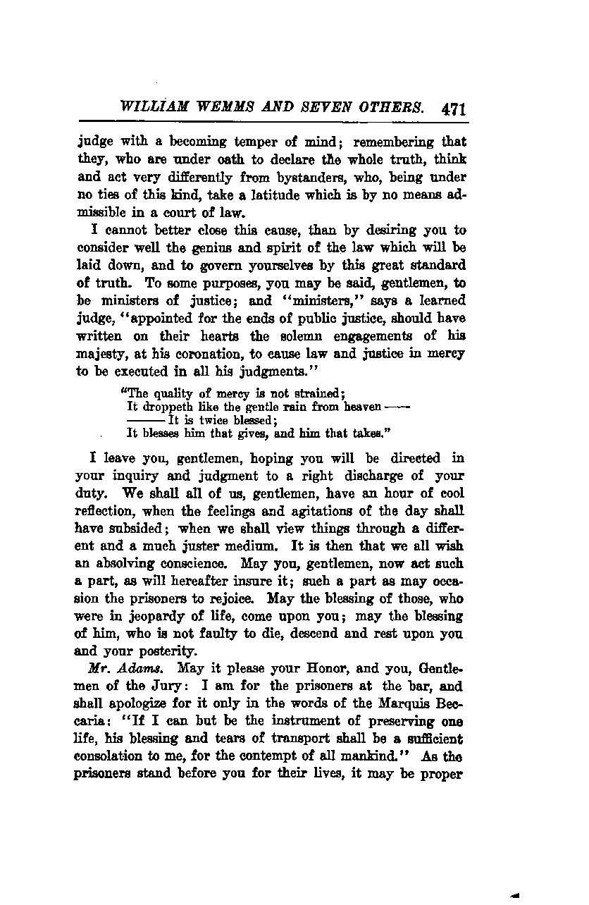 **Mr. Adams:** May it please your Honor, and you, Gentlemen of the Jury: I am for the prisoners at the bar, and shall apologize for it only in the words of the Marquis Beccaria: "If I can but be the instrument of preserving one life, his blessing and tears of transport shall be a sufficient consolation to me, for the contempt of all mankind." As the prisoners stand before you for their lives, it may be proper...
