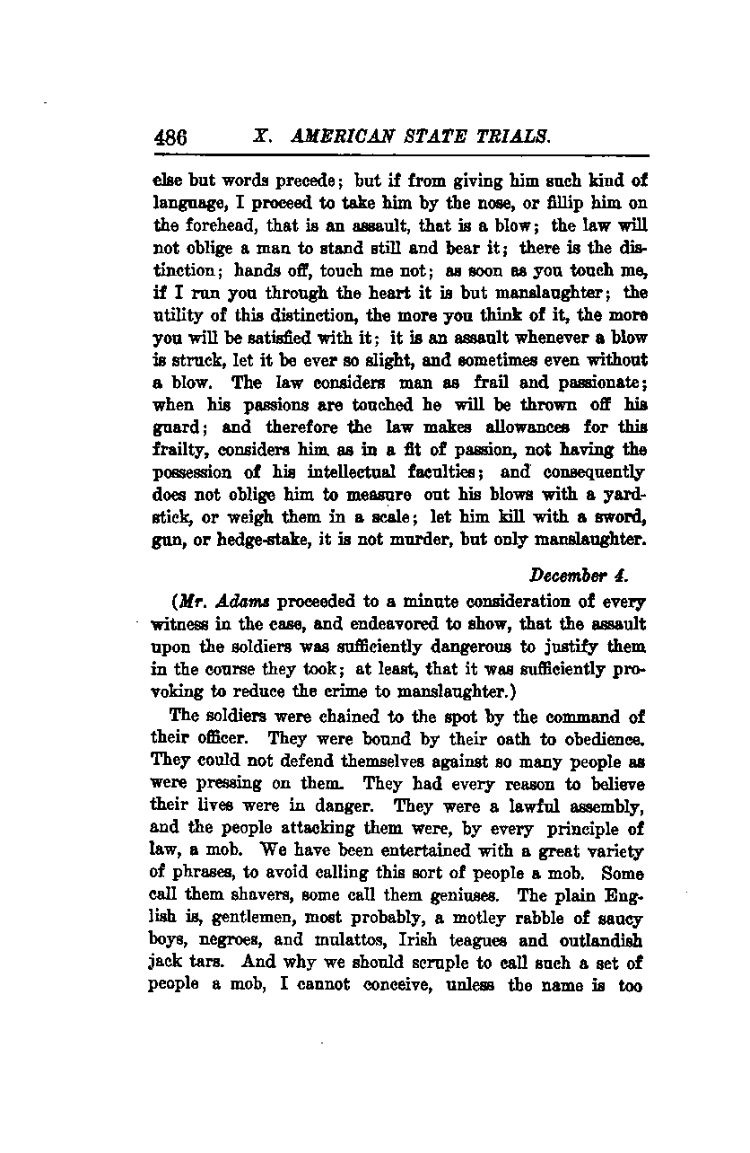Mr. Adams proceeded to a detailed examination of every witness in the case, endeavoring to demonstrate that the assault on the soldiers was sufficiently dangerous to justify their actions; at the very least, it was provocative enough to reduce the crime to manslaughter.