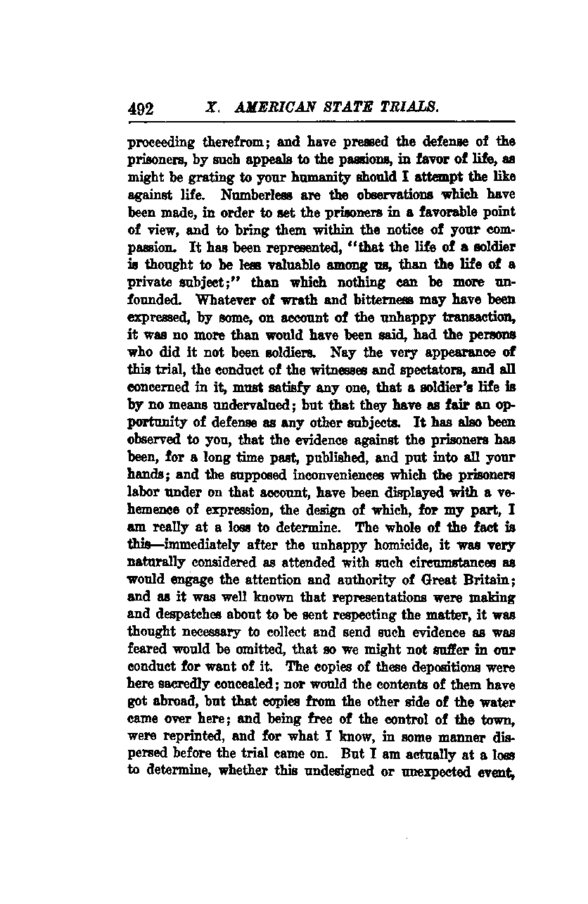 In the proceedings that have unfolded, the defense of the prisoners has been vigorously pursued, appealing to your passions in favor of life in a manner that might be unsettling to your humanity if I were to attempt a similar appeal against life. Numerous observations have been made to present the prisoners in a favorable light and to evoke your compassion. It has been suggested that "the life of a soldier is thought to be less valuable among us than the life of a private subject," a claim that is entirely unfounded. Whatever wrath and bitterness may have been expressed by some due to the unfortunate incident, it was no more than would have been said had the perpetrators not been soldiers. Indeed, the very conduct of this trial, the demeanor of the witnesses and spectators, and all those involved, should convince anyone that a soldier's life is not undervalued; rather, soldiers have as fair an opportunity for defense as any other subjects.