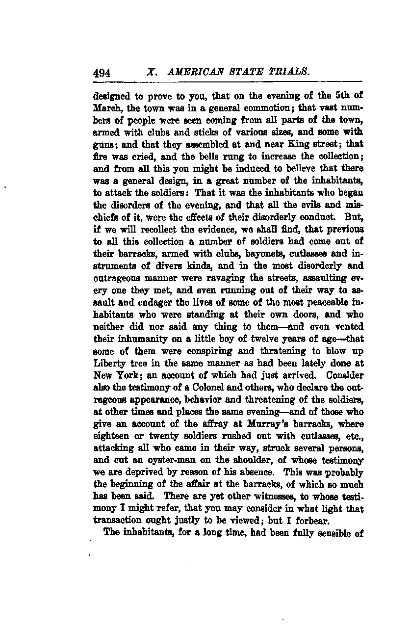 Consider also the testimony of a Colonel and others, who declare the outrageous appearance, behavior, and threatening of the soldiers at other times and places the same evening. Consider those who give an account of the affray at Murray’s barracks, where eighteen or twenty soldiers rushed out with cutlasses, etc., attacking all who came in their way. They struck several persons and cut an oyster-man on the shoulder, of whose testimony we are deprived by reason of his absence. This was probably the beginning of the affair at the barracks, of which so much has been said. There are yet other witnesses to whose testimony I might refer, that you may consider in what light that transaction ought justly to be viewed; but I forbear.