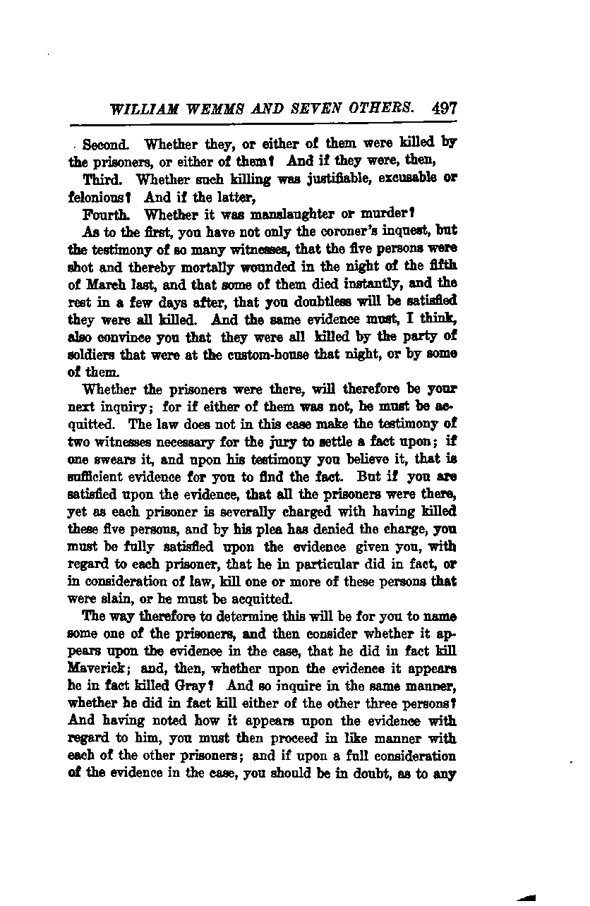 As to the first, you have not only the coroner's inquest but the testimony of so many witnesses that the five persons were shot and thereby mortally wounded on the night of the fifth of March last, and that some of them died instantly, and the rest in a few days after, that you will doubtless be satisfied they were all killed. And the same evidence must, I think, also convince you that they were all killed by the party of soldiers that were at the custom-house that night, or by some of them.