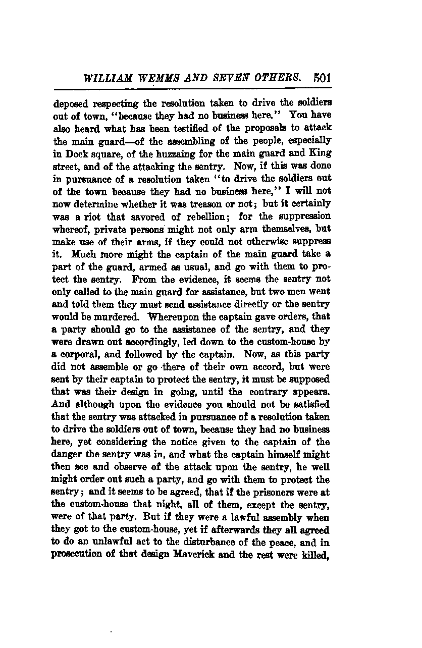 You have heard the deposition regarding the resolution to drive the soldiers out of town "because they had no business here." You have also heard testimony about the proposals to attack the main guard, the assembling of the people—especially in Dock Square—of the cheering for the main guard and King Street, and of the attack on the sentry. Now, if this was done in pursuance of a resolution taken "to drive the soldiers out of the town because they had no business here," I will not now determine whether it was treason or not; but it certainly was a riot that savored of rebellion. For the suppression of such a riot, private persons might not only arm themselves but also use their arms if they could not otherwise suppress it. Much more might the captain of the main guard take a part of the guard, armed as usual, and go with them to protect the sentry.