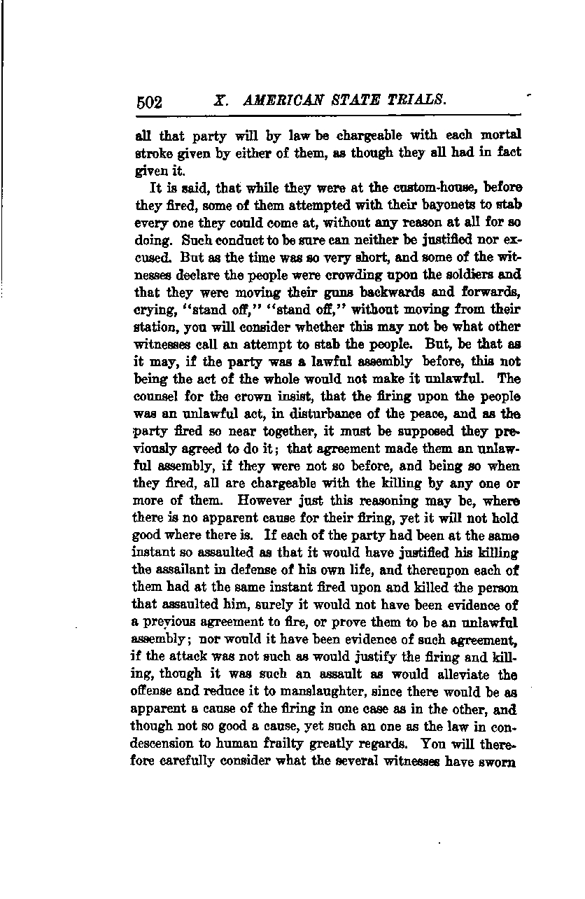 It is said that while they were at the custom-house, before they fired, some of them attempted to stab everyone they could reach with their bayonets, without any reason for doing so. Such conduct can neither be justified nor excused. However, as the time was very short, and some witnesses declare that the people were crowding upon the soldiers and that the soldiers were moving their guns backwards and forwards, crying, "Stand off," "Stand off," without moving from their station, you will consider whether this may not be what other witnesses call an attempt to stab the people. But, be that as it may, if the party was a lawful assembly before, this not being the act of the whole would not make it unlawful.