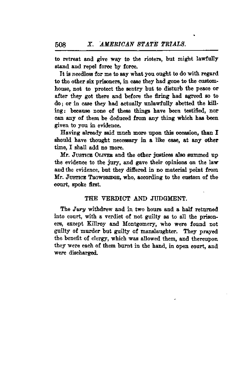 The jury withdrew and, after two and a half hours, returned to the court with a verdict of not guilty for all the prisoners except Killroy and Montgomery. These two were found not guilty of murder but guilty of manslaughter. They requested the benefit of clergy, which was granted to them. Consequently, they were each branded on the hand in open court and then discharged.