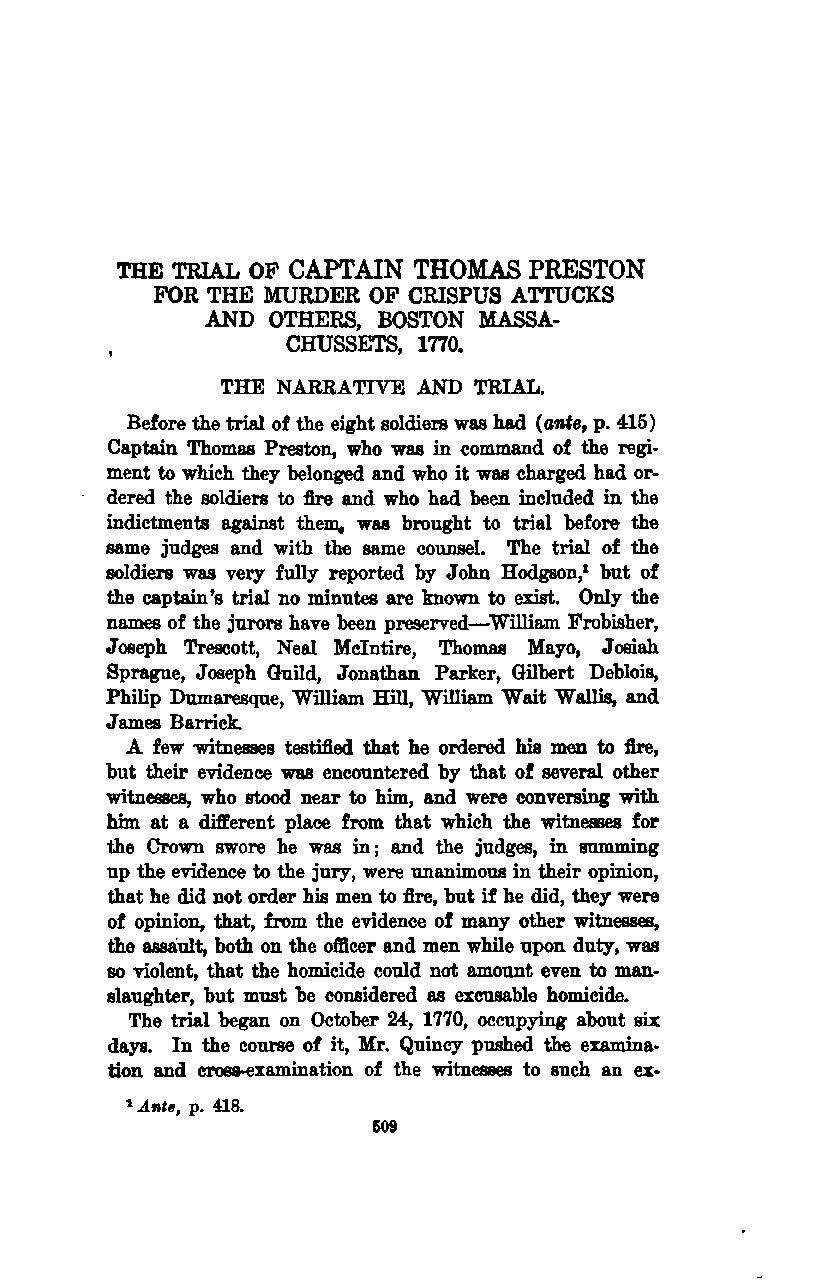 Before the trial of the eight soldiers was held (ante, p. 415), Captain Thomas Preston, who was in command of the regiment to which they belonged and who was charged with having ordered the soldiers to fire, and who had been included in the indictments against them, was brought to trial before the same judges and with the same counsel. The trial of the soldiers was very fully reported by John Hodgson; however, no minutes are known to exist of the captain’s trial. Only the names of the jurors have been preserved—William Frobisher, Joseph Trescott, Neal McIntire, Thomas Mayo, Josiah Sprague, Joseph Guild, Jonathan Parker, Gilbert Deblois, Philip Dumaresque, William Hill, William Wait Wallis, and James Barrick.
