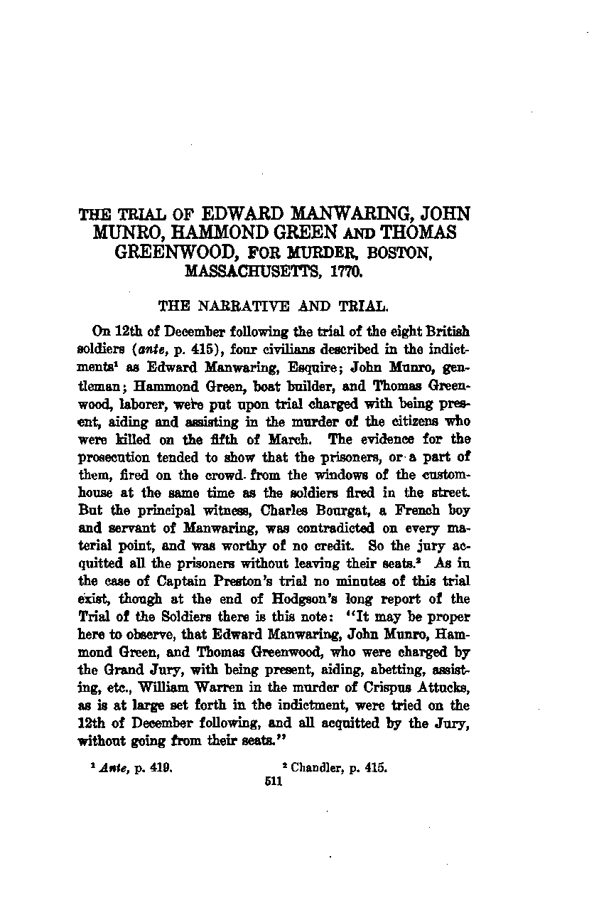 THE TRIAL OF EDWARD MANWARING, JOHN MUNRO, HAMMOND GREEN, AND THOMAS GREENWOOD, FOR MURDER, BOSTON, MASSACHUSETTS, 1770