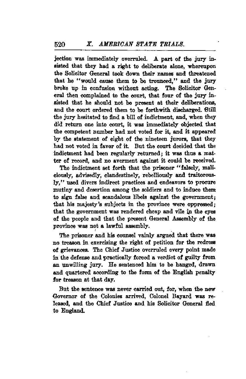 However, the sentence was never carried out. When the new Governor of the Colonies arrived, Colonel Bayard was released, and the Chief Justice and his Solicitor General fled to England.