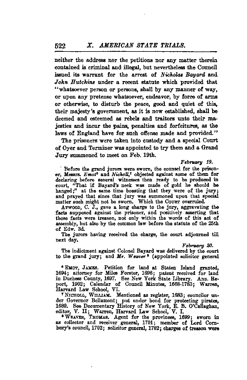 *Emott, James. Petition for land at Staten Island granted, 1694; attorney for Miles Forster, 1696; patent received for land in Duchess County, 1697. See New York State Library. Ann. Report, 1902; Calendar of Council Minutes, 1668-1783; Warren, Harvard Law School, VI.