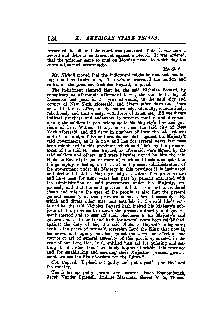 Mr. Nichol moved that the indictment be quashed, as it was not found by twelve men. The Court overruled the motion and called on the prisoner, Nicholas Bayard, to plead.