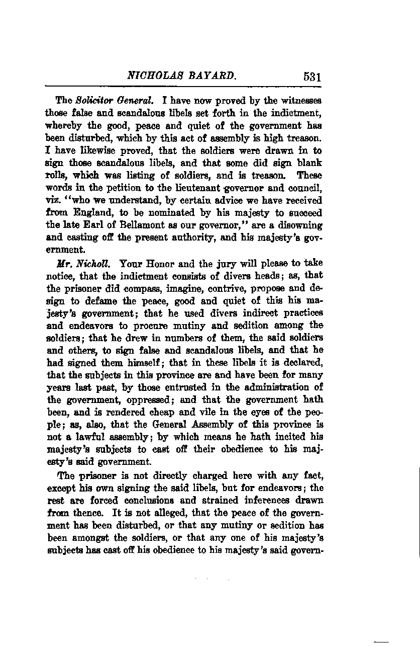 **The Solicitor General:** I have now proved by the witnesses those false and scandalous libels set forth in the indictment, whereby the good, peace, and quiet of the government have been disturbed, which by this act of assembly is high treason. I have likewise proved that the soldiers were drawn in to sign those scandalous libels, and that some did sign blank rolls, which was listing of soldiers, and is treason. These words in the petition to the lieutenant governor and council, viz. "who we understand, by certain advice we have received from England, to be nominated by his majesty to succeed the late Earl of Bellamont as our governor," are a disowning and casting off the present authority, and his majesty's government.