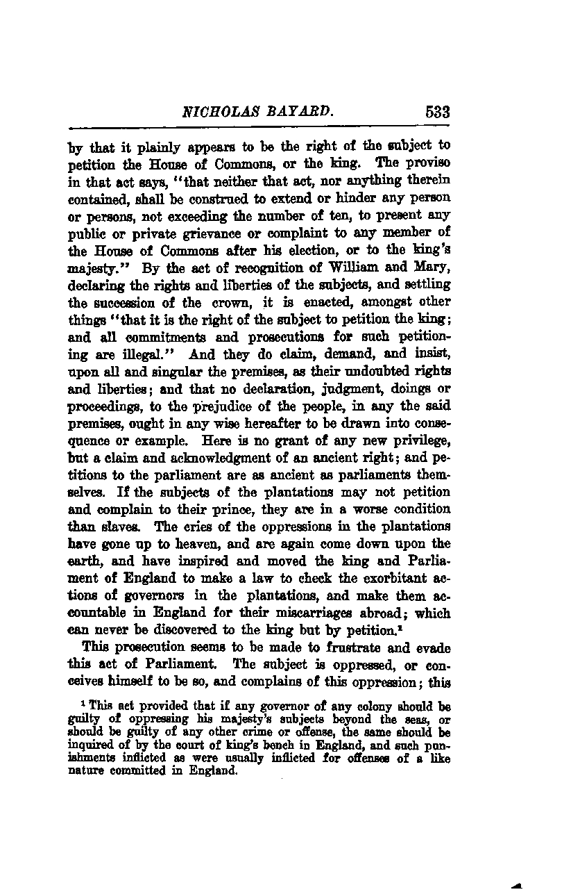 It plainly appears to be the right of the subject to petition the House of Commons, or the King. The proviso in that act says, "that neither that act, nor anything therein contained, shall be construed to extend or hinder any person or persons, not exceeding the number of ten, to present any public or private grievance or complaint to any member of the House of Commons after his election, or to the king's majesty." By the act of recognition of William and Mary, declaring the rights and liberties of the subjects, and settling the succession of the crown, it is enacted, amongst other things, "that it is the right of the subject to petition the king; and all commitments and prosecutions for such petitioning are illegal." And they do claim, demand, and insist upon all and singular the premises, as their undoubted rights and liberties; and that no declaration, judgment, doings, or proceedings, to the prejudice of the people, in any of the said premises, ought in any wise hereafter to be drawn into consequence or example. Here is no grant of any new privilege, but a claim and acknowledgment of an ancient right; and petitions to the parliament are as ancient as parliaments themselves. If the subjects of the plantations may not petition and complain to their prince, they are in a worse condition than slaves. The cries of the oppressions in the plantations have gone up to heaven, and are again come down upon the earth, and have inspired and moved the king and Parliament of England to make a law to check the exorbitant actions of governors in the plantations, and make them accountable in England for their miscarriages abroad; which can never be discovered to the king but by petition.