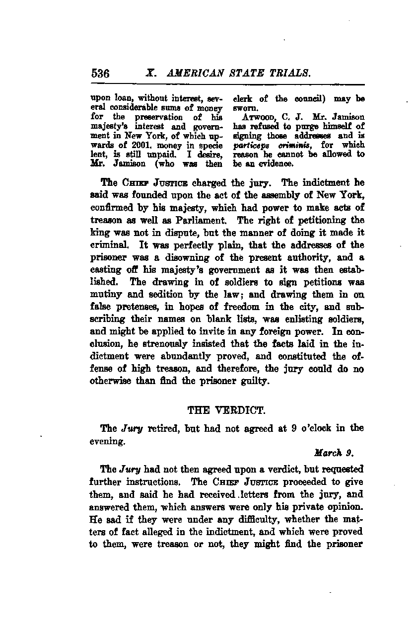The Chief Justice then charged the jury. He explained that the indictment was founded upon the act of the assembly of New York, confirmed by his majesty, which had the power to make acts of treason as well as Parliament. The right of petitioning the king was not in dispute, but the manner of doing it made it criminal. It was perfectly plain that the addresses of the prisoner were a disowning of the present authority and a casting off of his majesty's government as it was then established. The drawing in of soldiers to sign petitions was mutiny and sedition by law; and drawing them in on false pretenses, in hopes of freedom in the city, and subscribing their names on blank lists, was enlisting soldiers. This could be applied to invite in any foreign power. In conclusion, he strenuously insisted that the facts laid in the indictment were abundantly proved and constituted the offense of high treason. Therefore, the jury could do no otherwise than find the prisoner guilty.