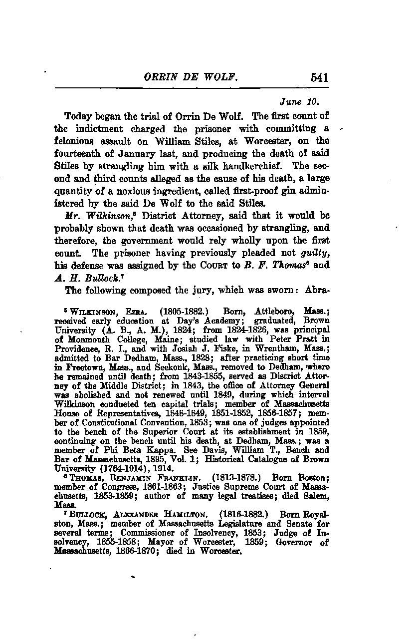 Today began the trial of Orrin De Wolf. The first count of the indictment charged the prisoner with committing a felonious assault on William Stiles at Worcester on the fourteenth of January last, and producing the death of said Stiles by strangling him with a silk handkerchief. The second and third counts alleged that the cause of his death was a large quantity of a noxious ingredient, called first-proof gin, administered by the said De Wolf to the said Stiles.
