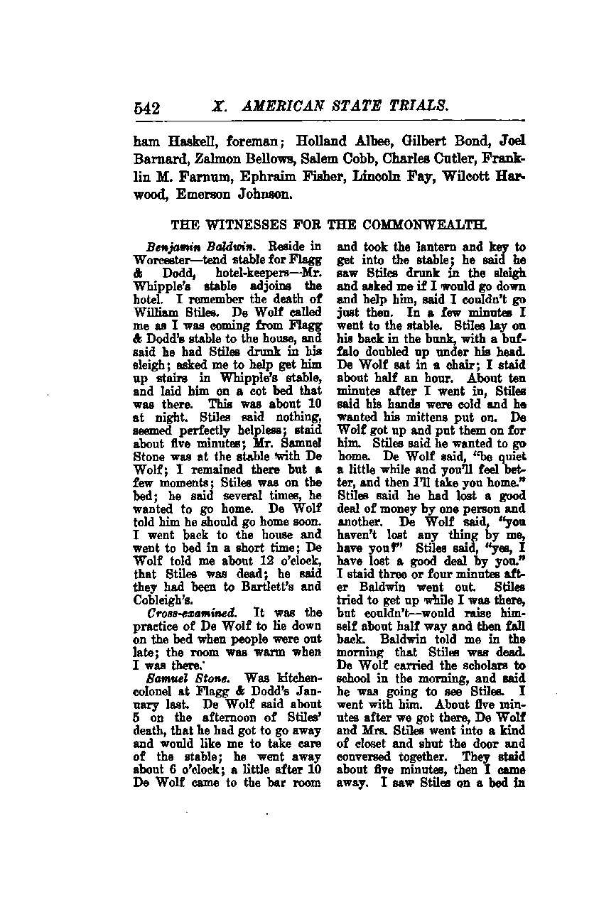 I was kitchen-colonel at Flagg & Dodd’s in January last. De Wolf said about 5 on the afternoon of Stiles’ death that he had to go away and would like me to take care of the stable. He went away about 6 o'clock. A little after 10, De Wolf came to the bar room and took the lantern and key to get into the stables. He saw Stiles drunk in the sleigh and asked me if I would go down and help him. I said I couldn't go just then. In a few minutes, I went to the stable. Stiles lay on his back in the bed with a buffalo doubled up under his head. De Wolf sat in a chair. I stayed about half an hour. About ten minutes after I went in, Stiles said his hands were cold and he wanted his mittens put on. De Wolf got up and put them on for him. Stiles said he wanted to go home. De Wolf said, "Be quiet a little while and you'll feel better, and then I'll take you home." Stiles said he had lost a good deal of money by one person and another. De Wolf said, "You haven't lost anything by me, have you?" Stiles said, "Yes, I have lost a good deal by you." I stayed three or four minutes after Baldwin went out. Stiles tried to get up while I was there but couldn't—would raise himself about halfway and then fall back. Baldwin told me in the morning that Stiles was dead. De Wolf carried the scholars to school in the morning and said he was going to see Stiles. I went with him. About five minutes after we got there, De Wolf and Mrs. Stiles went into a kind of closet and shut the door and conversed together. They stayed about five minutes, then I came away. I saw Stiles on a bed in the stable.