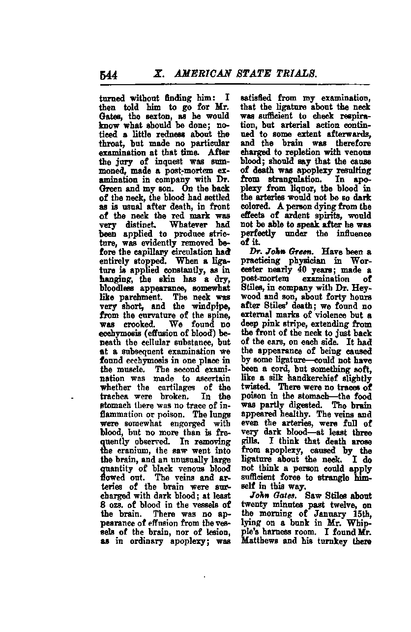 **Dr. John Green:** I have been a practicing physician in Worcester for nearly 40 years. I made a post-mortem examination of Stiles, in company with Dr. Heywood and his son, about forty hours after Stiles' death. We found no external marks of violence but a deep pink stripe, extending from the front of the neck to just back of the ears, on each side. It had the appearance of being caused by some ligature—could not have been a cord, but something soft, like a silk handkerchief slightly twisted. There were no traces of poison in the stomach—the food was partly digested. The brain appeared healthy. The veins and even the arteries were full of very dark blood—at least three gills. I think that death arose from apoplexy, caused by the ligature about the neck. I do not think a person could apply sufficient force to strangle himself in this way.