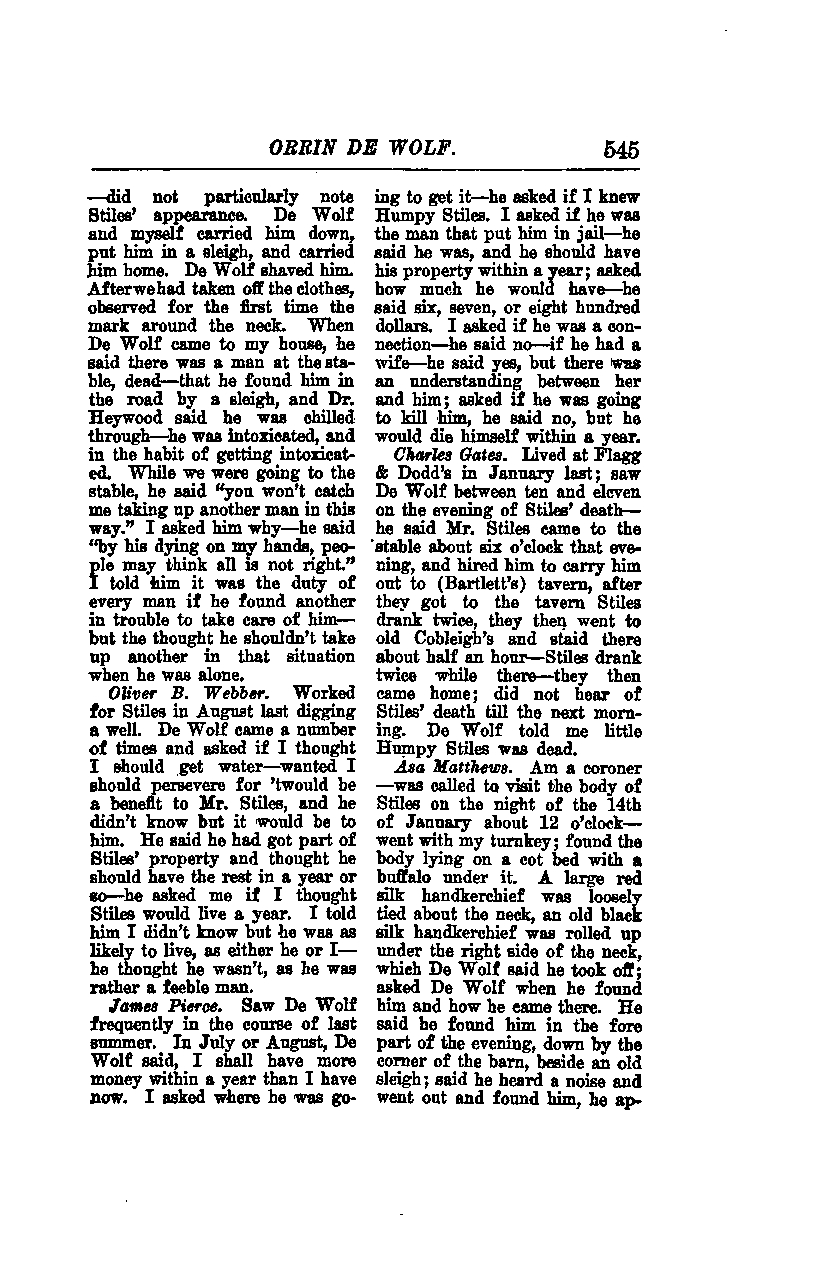 Am a coroner—was called to visit the body of Stiles on the night of the 14th of January about 12 o’clock—went with my turnkey; found the body lying on a cot bed with a buffalo under it. A large red silk handkerchief was loosely tied about the neck, and an old black silk handkerchief was rolled up under the right side of the neck, which De Wolf said he took off; asked De Wolf when he found him and how he came there. He said he found him in the fore part of the evening, down by the corner of the barn, beside an old sleigh; said he heard a noise and went out and found him, he appeared...