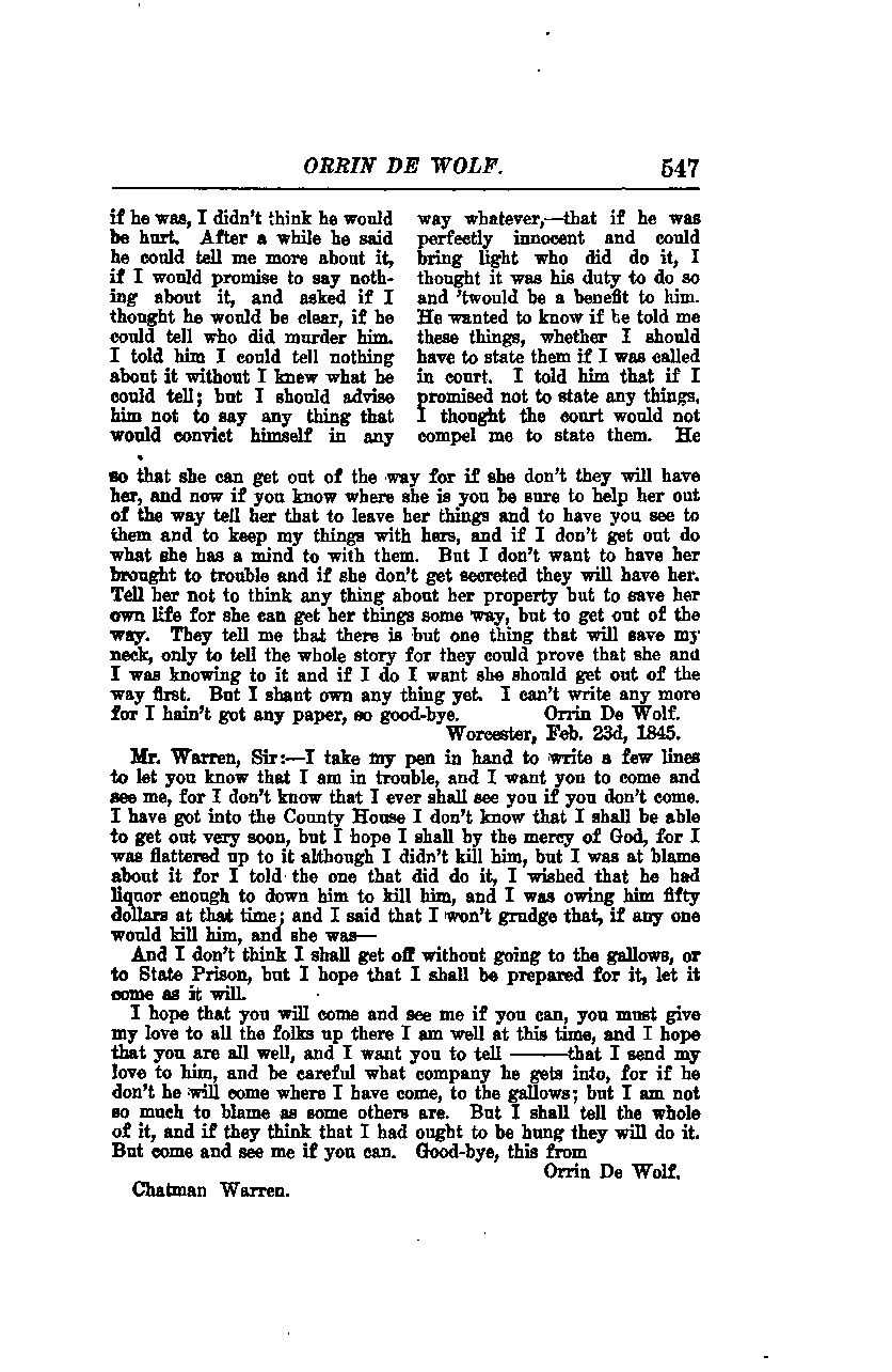 He said that she can get out of the way, for if she doesn’t, they will have her. Now, if you know where she is, you be sure to help her out of the way. Tell her to leave her things and to have you see to them and to keep my things with hers. And if I don’t get out, do what she has a mind to with them. But I don’t want to have her brought to trouble, and if she doesn’t get secreted, they will have her. Tell her not to think anything about her property but to save her own life, for she can get her things some way, but to get out of the way. They tell me that there is but one thing that will save my neck: only to tell the whole story, for they could prove that she and I were knowing to it. And if I do, I want her to get out of the way first. But I shan’t own anything yet. I can’t write any more, for I haven’t got any paper, so good-bye, Orrin De Wolf.