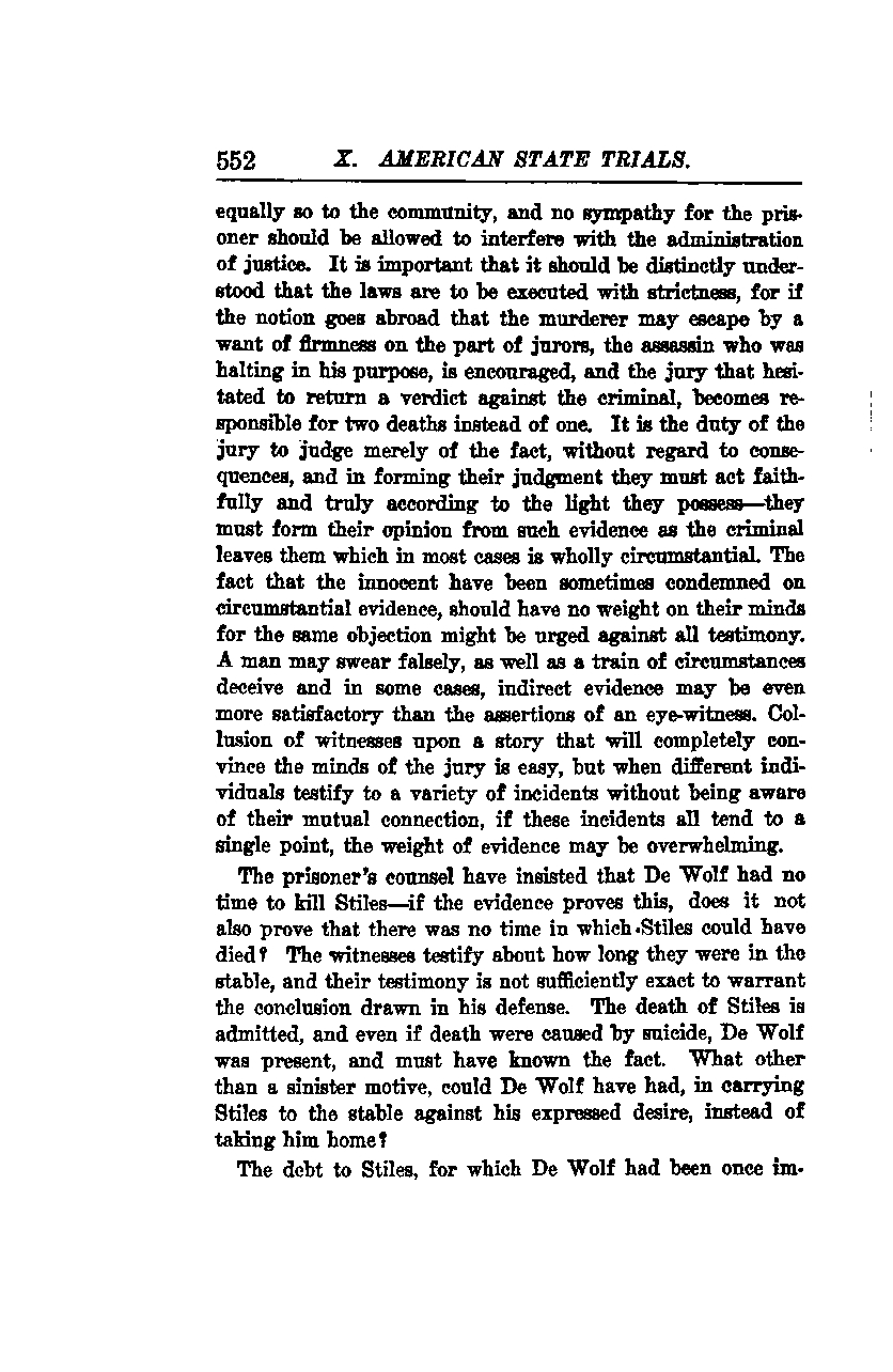 It is essential that the community understands the importance of the strict execution of laws, and no sympathy for the prisoner should be allowed to interfere with the administration of justice. If the notion spreads that a murderer may escape due to a lack of firmness on the part of jurors, it could encourage an assassin who is wavering in his purpose. Consequently, the jury that hesitates to return a verdict against the criminal becomes responsible for two deaths instead of one. It is the duty of the jury to judge merely the facts, without regard to consequences. In forming their judgment, they must act faithfully and truly according to the light they possess—they must form their opinion from the evidence available, which in most cases is wholly circumstantial. The fact that the innocent have sometimes been condemned on circumstantial evidence should not weigh on their minds, for the same objection might be urged against all testimony. A man may swear falsely, just as a series of circumstances may deceive. In some cases, indirect evidence may be even more satisfactory than the assertions of an eyewitness. Collusion of witnesses upon a story that will completely convince the minds of the jury is easy, but when different individuals testify to a variety of incidents without being aware of their mutual connection, and if these incidents all tend to a single point, the weight of evidence may be overwhelming.