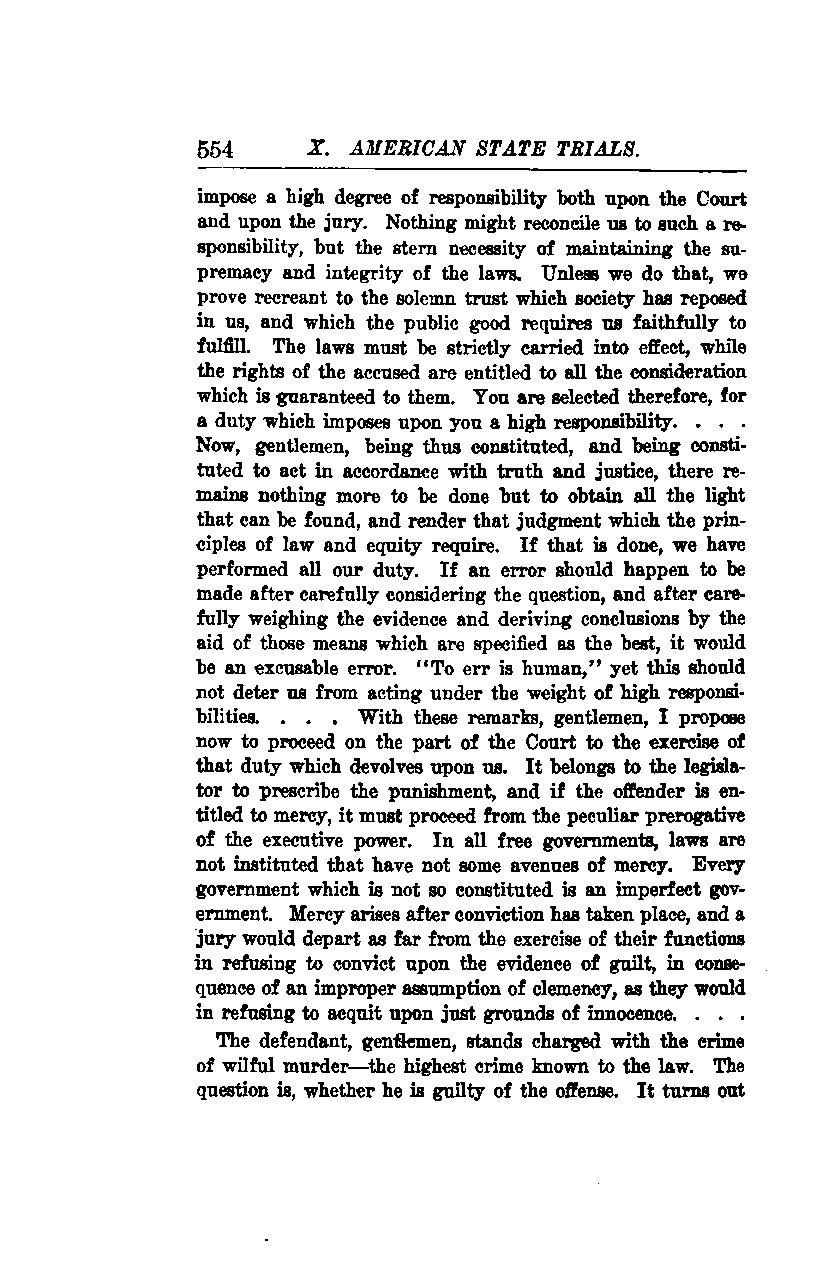 The responsibility imposed upon both the Court and the jury is immense. Nothing might reconcile us to such a responsibility, but the stern necessity of maintaining the supremacy and integrity of the laws. Unless we do that, we prove recreant to the solemn trust which society has reposed in us, and which the public good requires us faithfully to fulfill. The laws must be strictly carried into effect, while the rights of the accused are entitled to all the consideration which is guaranteed to them. You are selected, therefore, for a duty which imposes upon you a high responsibility.