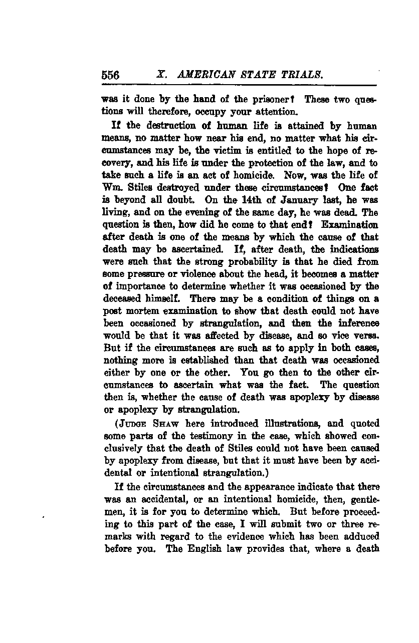 If the circumstances and the appearance indicate that there was an accidental or an intentional homicide, then, gentlemen, it is for you to determine which. But before proceeding to this part of the case, I will submit two or three remarks with regard to the evidence which has been adduced before you. The English law provides that, where a death...