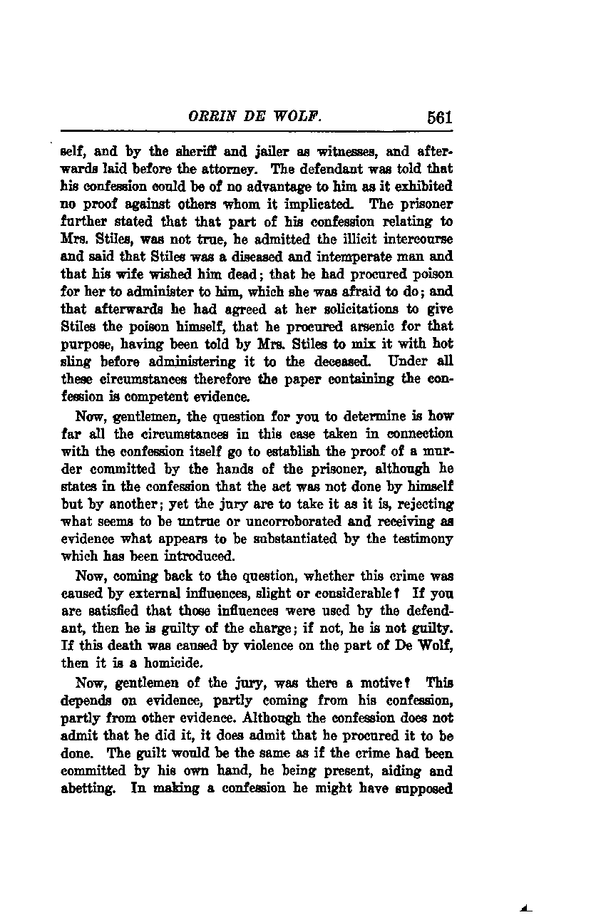 Orrin De Wolf's confession was witnessed by the sheriff and jailer and subsequently presented to the attorney. The defendant was informed that his confession would not benefit him as it did not provide evidence against others implicated in the statement. The prisoner further stated that the part of his confession relating to Mrs. Stiles was untrue. He admitted to the illicit intercourse and claimed that Stiles was a diseased and intemperate man whose wife wished him dead. De Wolf confessed that he had procured poison for Mrs. Stiles to administer to her husband, but she was afraid to do so. He then agreed, at her request, to give Stiles the poison himself. De Wolf obtained arsenic for this purpose, having been instructed by Mrs. Stiles to mix it with hot sling before administering it to the deceased. Under these circumstances, the document containing the confession is admissible as evidence.