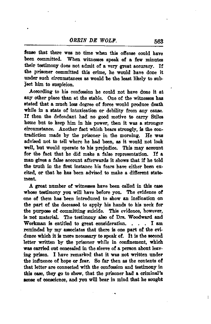 A great number of witnesses have been called in this case, and their testimony will be before you. The evidence of one of them has been introduced to show an inclination on the part of the deceased to apply his hands to his neck for the purpose of committing suicide. This evidence, however, is not material. The testimony of Drs. Woodward and Workman is entitled to great consideration. I am reminded by my associates that there is one part of the evidence which it is more necessary to speak of. It is the second letter written by the prisoner while in confinement, which was carried out concealed in the sleeve of a person about to leave prison. I have remarked that it was not written under the influence of hope or fear. So far then as the contents of that letter are connected with the confession and testimony in this case, they go to show that the prisoner had a criminal's sense of conscience, and you will bear in mind that he sought to conceal his actions.