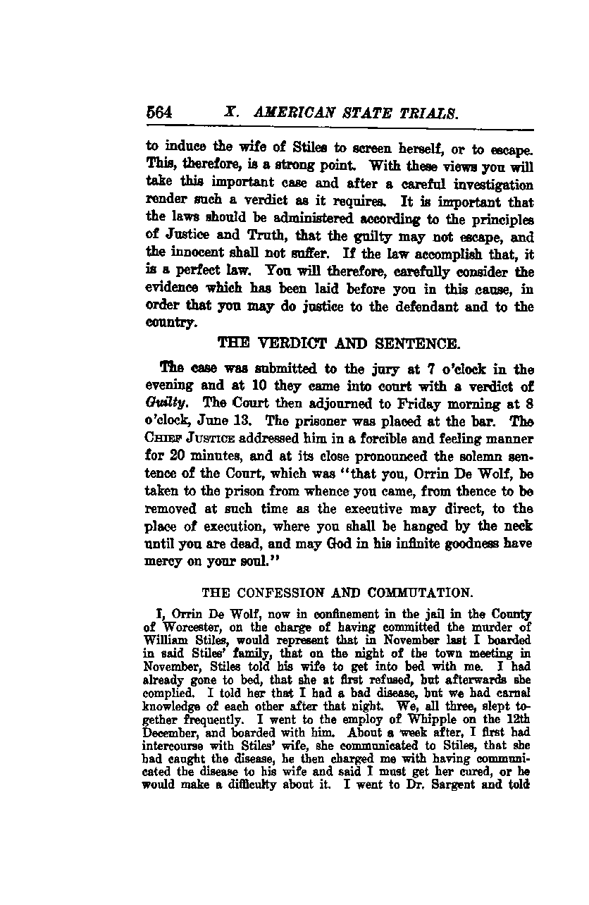 I, Orrin De Wolf, now in confinement in the jail in the County of Worcester, on the charge of having committed the murder of William Stiles, would represent that in November last, I boarded in said Stiles' family. On the night of the town meeting in November, Stiles told his wife to get into bed with me; I had already gone to bed. She at first refused, but afterwards complied. I told her that I had a bad disease, but we had carnal knowledge of each other after that night. We, all three, slept together frequently. I went to the employ of Whipple on the 12th of December and boarded with him. About a week after, I first had intercourse with Stiles' wife; she communicated to Stiles that she had caught the disease. He then charged me with having communicated the disease to his wife and said I must get her cured, or he would make a difficulty about it. I went to Dr. Sargent and told him.