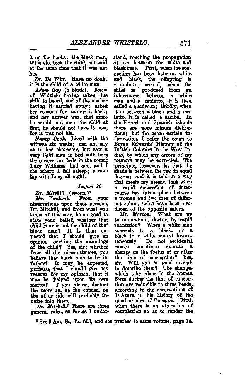 **Dr. Mitchill:** There are three general rules, as far as I understand, touching the propagation of men between the white and black race. First, when the connection has been between white and black, the offspring is a mulatto; second, when the child is produced from an intercourse between a white man and a mulatto, it is then called a quadroon; thirdly, when it is between a black and a mulatto, it is called a sambo. In the French and Spanish islands, there are more minute distinctions; but for more certain information, I refer the court to Bryan Edwards’ History of the British Colonies in the West Indies, by which any errors of my memory may be corrected. The principle, however, is that the shade is between the two in equal degree; and it is told in a way that meets my assent, that when a rapid succession of intercourse has taken place between a woman and two men of different colors, twins have been produced of the opposite colors.