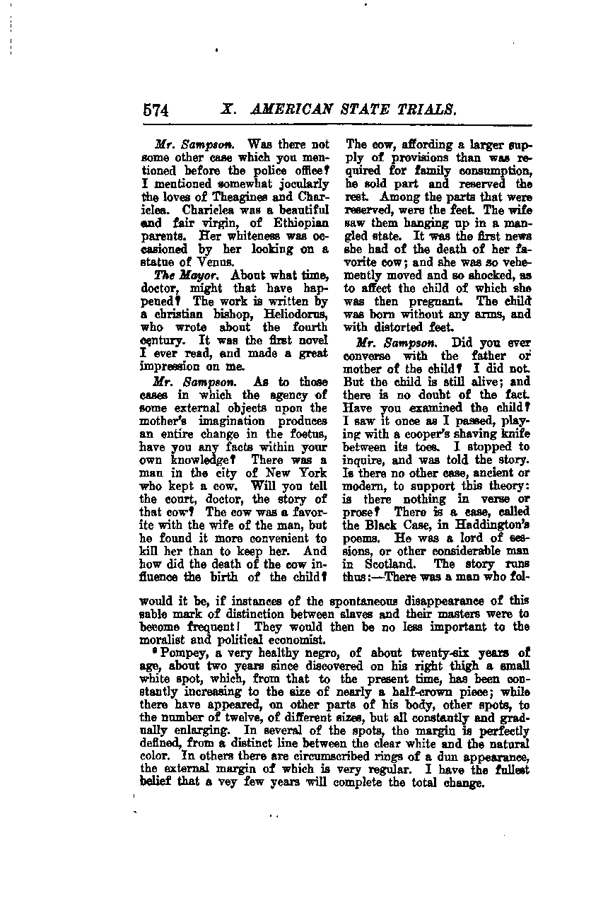 **Mr. Sampson:** As to those cases in which the agency of some external objects upon the mother’s imagination produces an entire change in the fetus, have you any facts within your own knowledge?