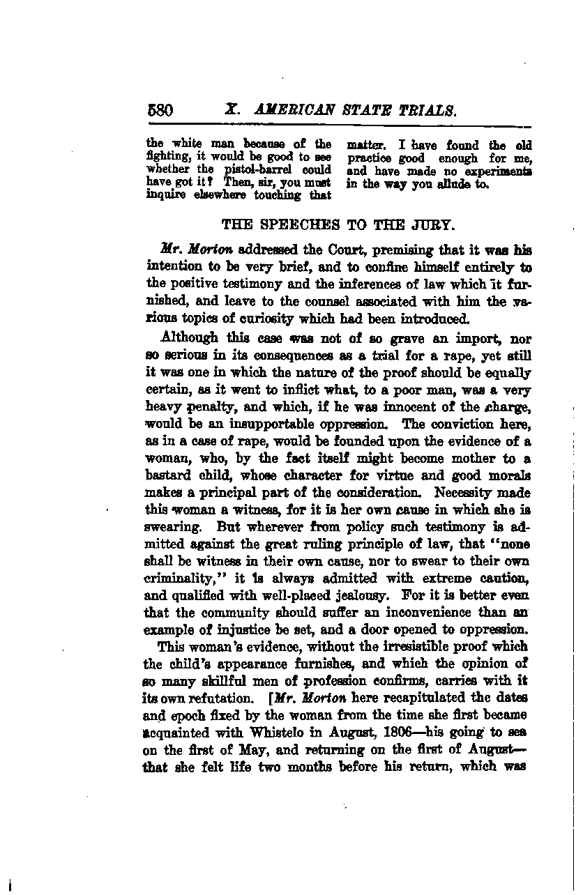 This woman's evidence, without the irresistible proof which the child's appearance furnishes, and which the opinion of so many skillful men of the profession confirms, carries with it its own refutation. Mr. Morton here recapitulated the dates and epochs fixed by the woman from the time she first became acquainted with Whistelo in August 1806—his going to sea on the first of May, and returning on the first of August—that she felt life two months before his return, which was...