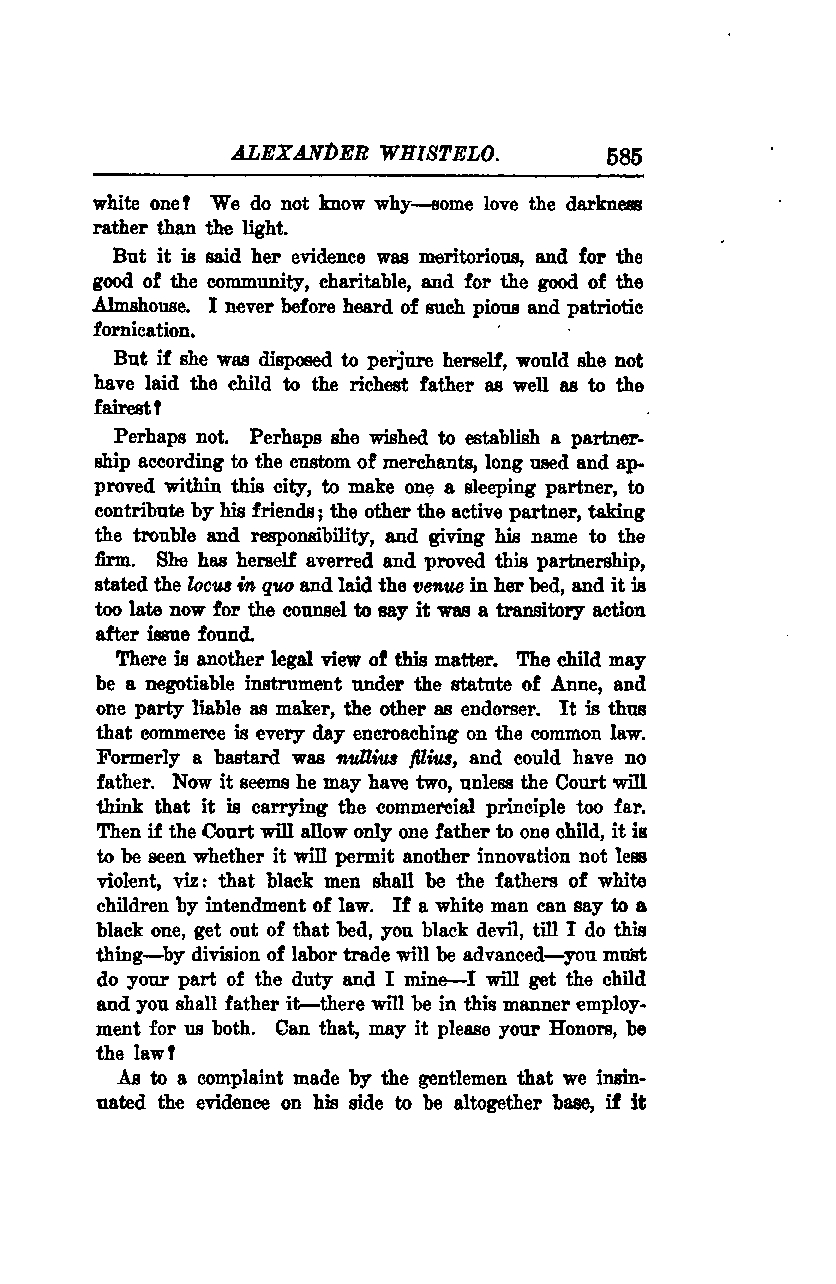 There is another legal perspective on this matter. The child may be considered a negotiable instrument under the Statute of Anne, with one party liable as the maker and the other as the endorser. Commerce is thus encroaching on common law every day. Formerly, a bastard was nullius filius and could have no father. Now, it seems he may have two, unless the Court deems that it is carrying the commercial principle too far. Then, if the Court will allow only one father to one child, it remains to be seen whether it will permit another innovation, no less violent, namely, that black men shall be the fathers of white children by intendment of law. If a white man can say to a black one, "Get out of that bed, you black devil, until I do this thing," by division of labor, trade will be advanced—you must do your part of the duty and I mine—I will get the child and you shall father it—there will be employment for us both in this manner. Can that, may it please your Honors, be the law?
