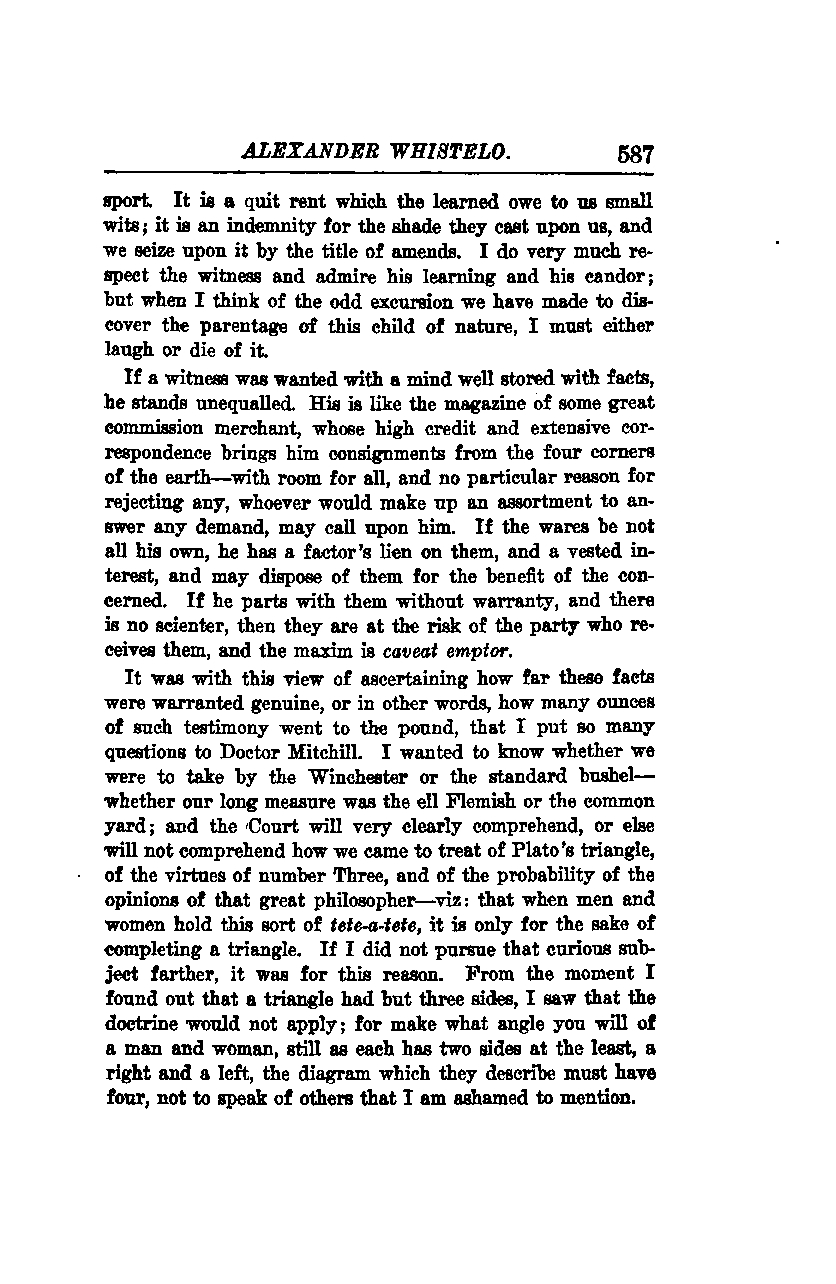 It was with this view of ascertaining how far these facts were warranted genuine, or in other words, how many ounces of such testimony went to the pound, that I put so many questions to Doctor Mitchill. I wanted to know whether we were to take by the Winchester or the standard bushel, whether our long measure was the ell Flemish or the common yard; and the Court will very clearly comprehend, or else will not comprehend how we came to treat of Plato's triangle, of the virtues of number Three, and of the probability of the opinions of that great philosopher—viz: that when men and women hold this sort of tête-à-tête, it is only for the sake of completing a triangle. If I did not pursue that curious subject further, it was for this reason. From the moment I found out that a triangle had but three sides, I saw that the doctrine would not apply; for make what angle you will of a man and woman, still as each has two sides at the least, a right and a left, the diagram which they describe must have four, not to speak of others that I am ashamed to mention.