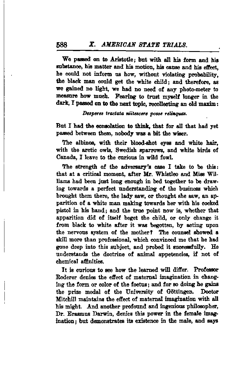 The strength of the adversary's case I take to be this: that at a critical moment, after Mr. Whistleo and Miss Williams had been just long enough in bed together to be drawing towards a perfect understanding of the business which brought them there, the lady saw, or thought she saw, an apparition of a white man making towards her with his cocked pistol in his hand. The true point now is whether that apparition did of itself beget the child, or only change it from black to white after it was begotten, by acting upon the nervous system of the mother. The counsel showed a skill more than professional, which convinced me that he had gone deep into this subject and probed it successfully. He understands the doctrine of animal appetencies, if not of chemical affinities.