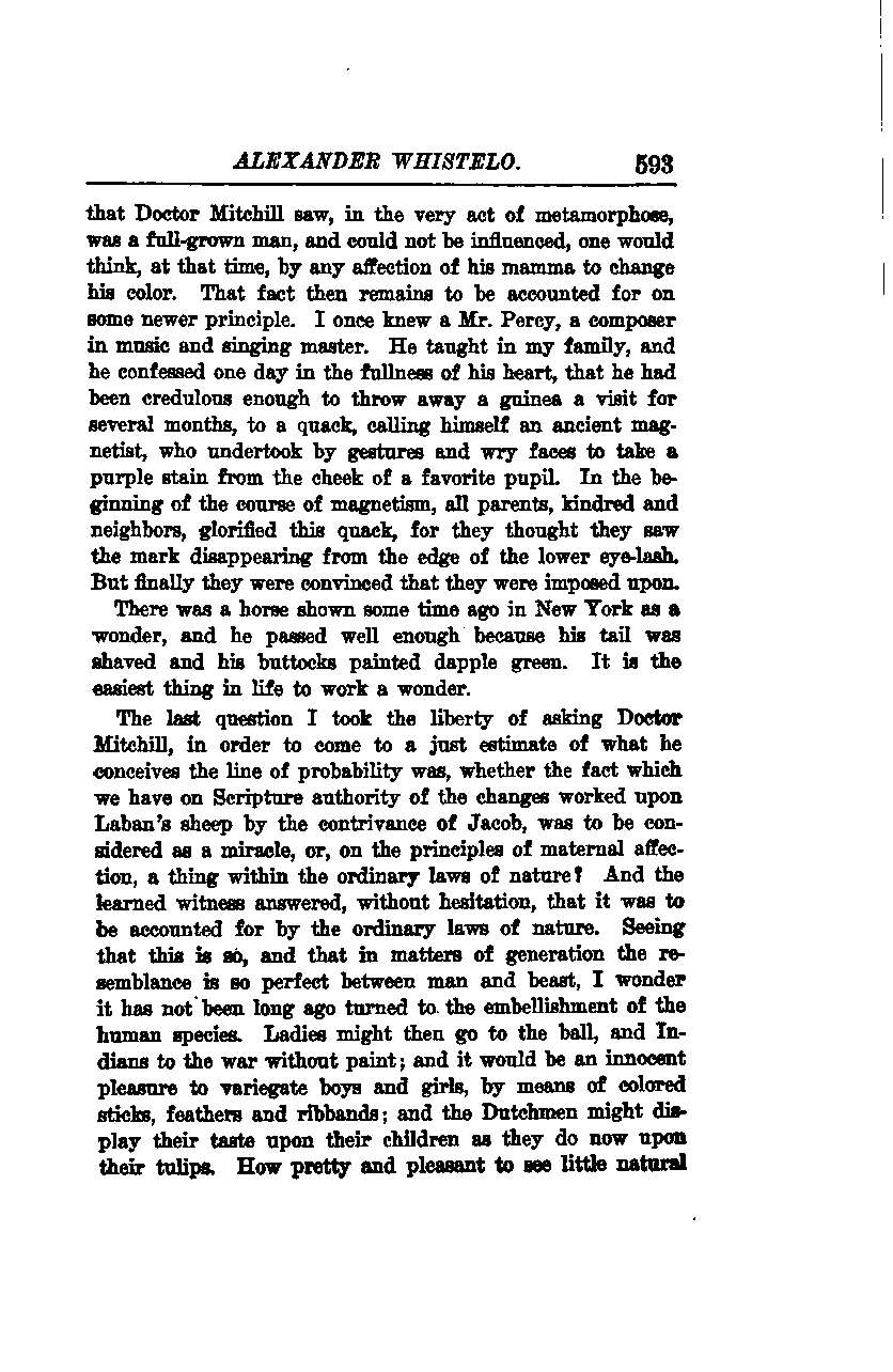 The last question I took the liberty of asking Doctor Mitchill was to come to a just estimate of what he conceives the line of probability to be. I asked whether the fact, which we have on scriptural authority, of the changes worked upon Laban’s sheep by Jacob's contrivance, should be considered a miracle or, based on the principles of maternal affection, a phenomenon within the ordinary laws of nature. The learned witness answered without hesitation that it was to be accounted for by the ordinary laws of nature. Seeing that this is so, and that in matters of generation the resemblance is so perfect between man and beast, I wonder why it has not long ago been used for the embellishment of the human species. Ladies might then attend balls, and Indians go to war without paint; it would be an innocent pleasure to variegate boys and girls by means of colored sticks, feathers, and ribbons. The Dutch might display their taste on their children as they now do on their tulips. How pretty and pleasant it would be to see little natural adornments.