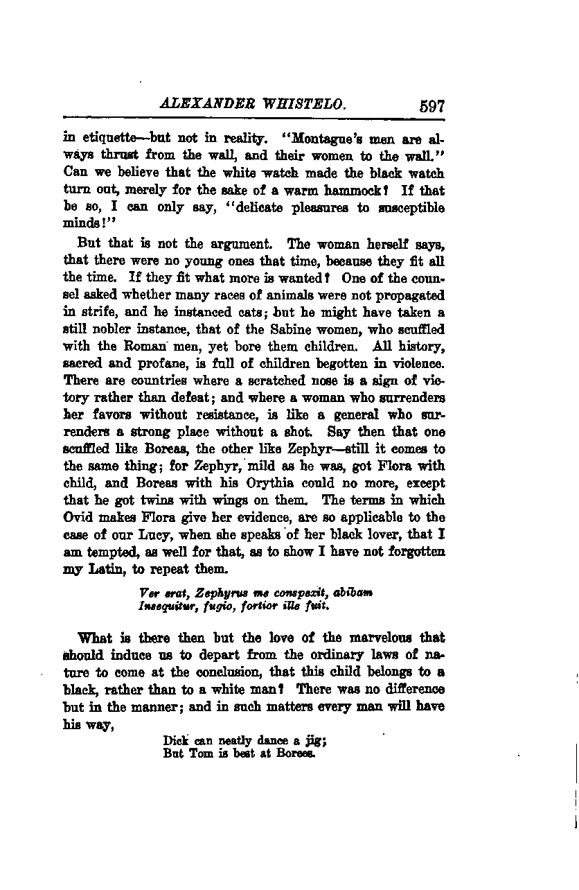 But that is not the argument. The woman herself says that there were no young ones that time, because they fought all the time. If they fought, what more is wanted? One of the counsel asked whether many races of animals were not propagated in strife, and he instanced cats; but he might have taken a still nobler instance, that of the Sabine women, who scuffled with the Roman men, yet bore them children. All history, sacred and profane, is full of children begotten in violence. There are countries where a scratched nose is a sign of victory rather than defeat; and where a woman who surrenders her favors without resistance, is like a general who surrenders a strong place without a shot. Say then that one scuffled like Boreas, the other like Zephyr—still it comes to the same thing; for Zephyr, mild as he was, got Flora with child, and Boreas with his Orythia could do no more, except that he got twins with wings on them. The terms in which Ovid makes Flora give her evidence, are so applicable to the case of our Lucy, when she speaks of her black lover, that I am tempted, as well for that, as to show I have not forgotten my Latin, to repeat them: