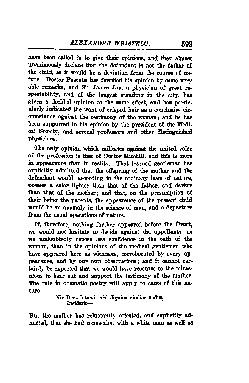 Several medical experts have been called to give their opinions, and they almost unanimously declare that the defendant is not the father of the child, as it would be a deviation from the course of nature. Doctor Pascalis has fortified his opinion with some very able remarks; and Sir James Jay, a physician of great respectability and of the longest standing in the city, has given a decided opinion to the same effect. He has particularly indicated the want of crisped hair as a conclusive circumstance against the testimony of the woman. Sir James Jay has been supported in his opinion by the president of the Medical Society, and several professors and other distinguished physicians.